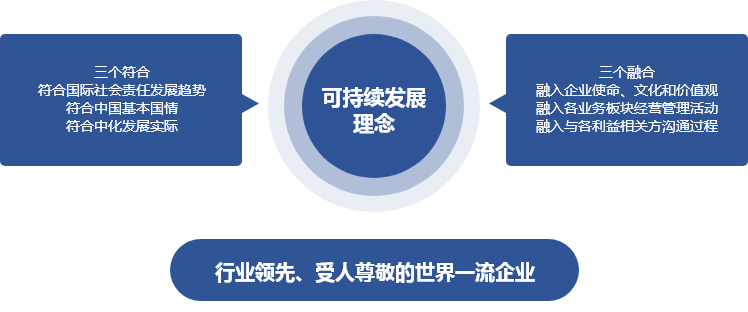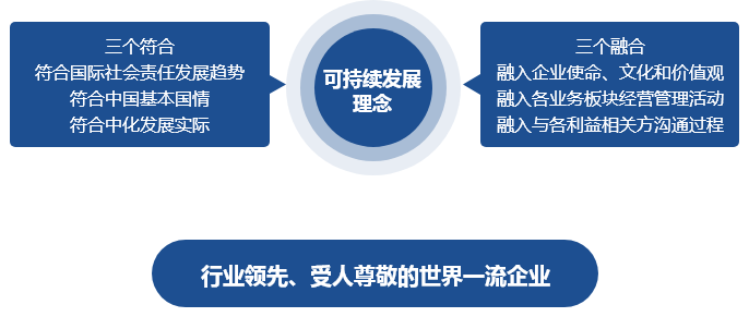 中国中化秉持“科学至上”理念,形成 “三个符合”“三个融入”的可持续发展观,通过创新发展和卓越管理,为社会、客户、股东、员工奉献一流产品和服务,创造最大价值,成为行业内资源节约、环境友好的典范,实现企业发展与社会发展、环境保护的和谐统一。